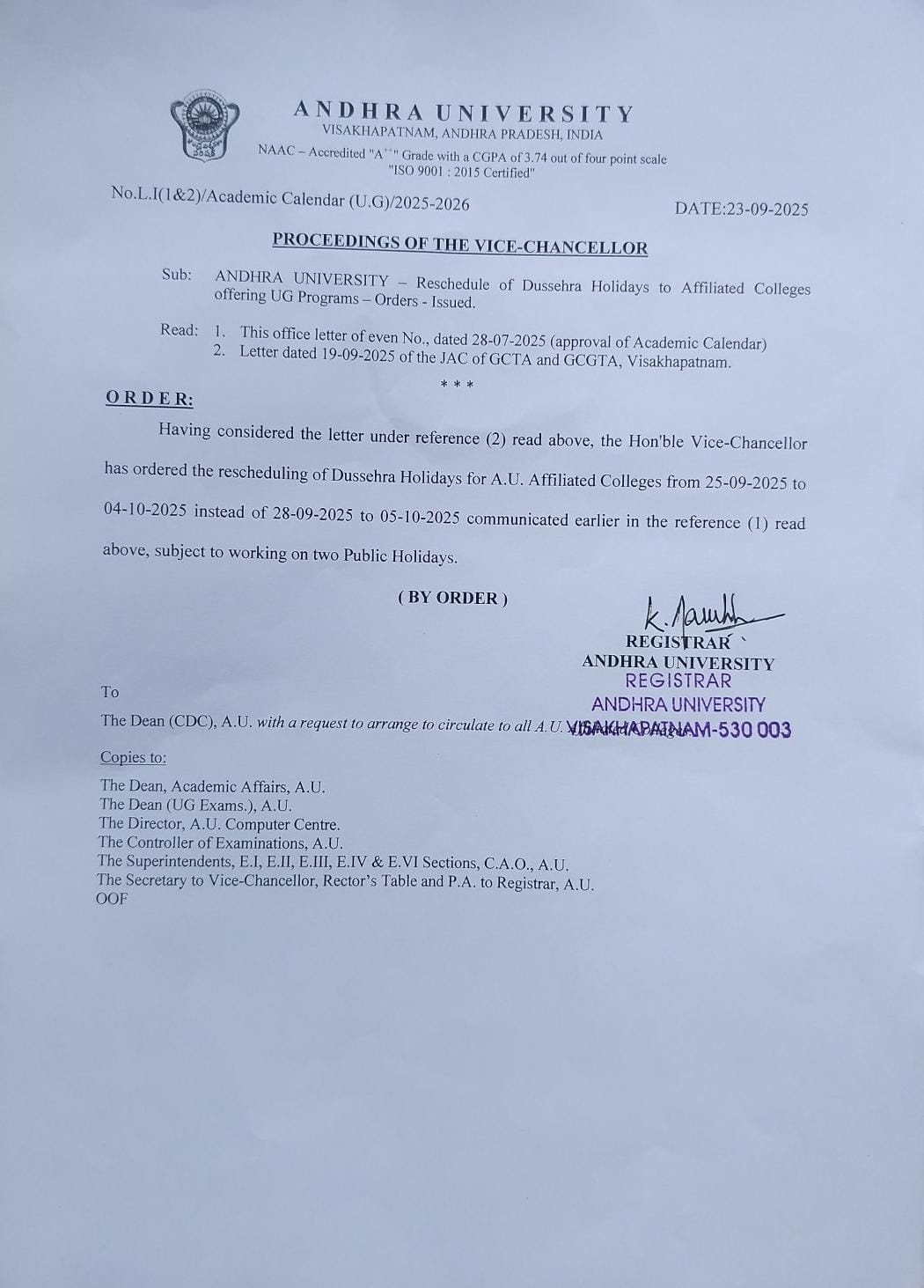 - 24/09/2025 :: Resheduling of Dussehra Holidays for AU affliated Colleges offering UG Courses